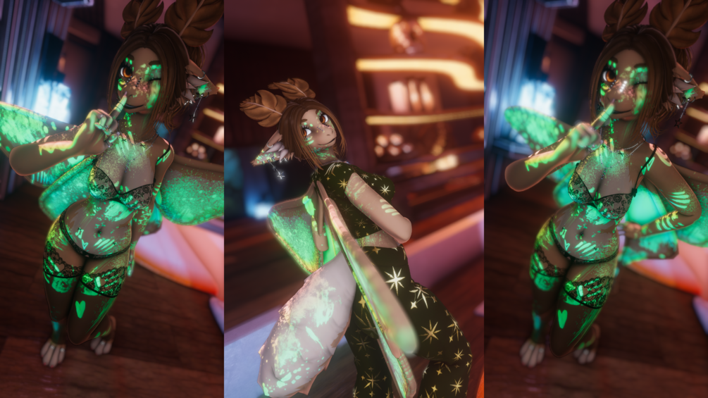 - Customize: Body Emission + Hue, Hair Emission + Hue, Eye Color, Glitter + Hue, Thigh Size Sliders, Chest Size Sliders, Tummy Size Slider, Bum Size Slider,